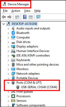 - For Windows 10 use "Device Manager" and check that "USB-SERIAL CH340 (COMx)" (the number "x" will vary) is displayed under "Ports (COM & LPT)".